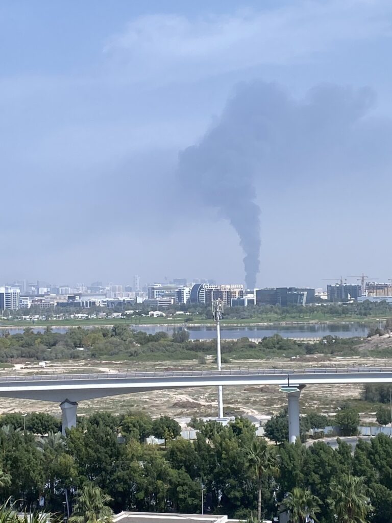 Kuvasin koti-Suomeen maisemia uuden hotellimme ikkunasta saatetekstillä “ei tässä mitään hätää ole“, kun alkoi paukkua. Hävittäjien ja/tai droonien äänet kaikuivat paksujen ikkunalasien läpi. Jostain rakennusten takaa nousi musta savupilvi. Siellä suunnassa oli lentokenttä. Olo oli jotenkin irrallinen. Oksetti.