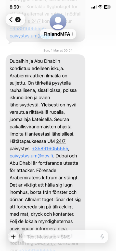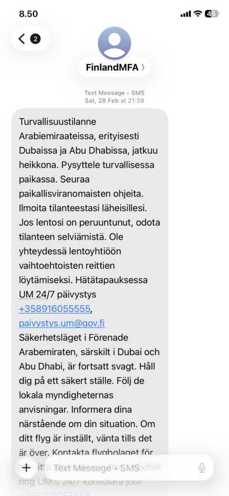 Räjähdyksistä ei mennyt kauan, kun jo Finnairilta tuli tieto, että lentomme on peruttu. Lentotila oli suljettu konfliktin vuoksi. Lähes samantien saimme heiltä uudelleen reititetyt lennot Milanon kautta Suomeen tiistaille, voucherit viiden tähden Grand Hyatt Dubai hotelliin ja takseihin. Tässä vaiheessa kehuin Finnairin ripeää toimintaa. Kaikki tuntui toimivan erinomaisesti.