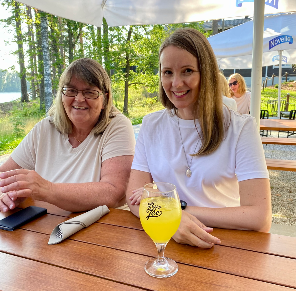 Siirryimme nauttimaan illallista pienelle pihaterassille järven rantaan. Tässä vaiheessa vanhempani olivat liittyneet seuraamme. Kesäillassa aika kului rattoisasti kuulumisia vaihtaen, ja auringon lämmöstä nauttien. Muilla terassilla ruokailijoilla oli mukana karvalapsia, joiden nättiä käytöstä seurasin kaiholla. Meidän labbis olisi kerjännyt kyynelsilmin ja sydäntäsärkevällä ilmeellä viimeiseen muruun saakka. Hänelle kuuluisi kyllä Oscar-palkinto näyttelijän lahjoista. Labbisten omistajat kyllä varmasti tunnistavat ;).