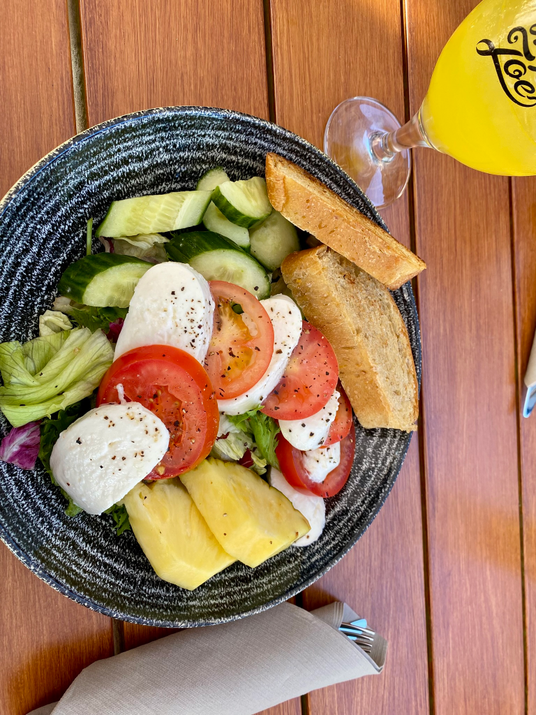 Illalliselle vaihtoehtoina olivat joko buffet, tai sitten ruokalan alakerrassa sijainnut ravintola. Buffetin ruoka näytti terveelliseltä ja maittavalta, mutta sipulikammoiselle sienirisotossa kiiltelevät sipulinpalaset olivat pelkokerrointasolla liikaa. Päädyin siis tilaamaan kellarin aurinkoiselta rouvalta listalta salaatin – ilman mitään kasvista missä on sana sipuli.