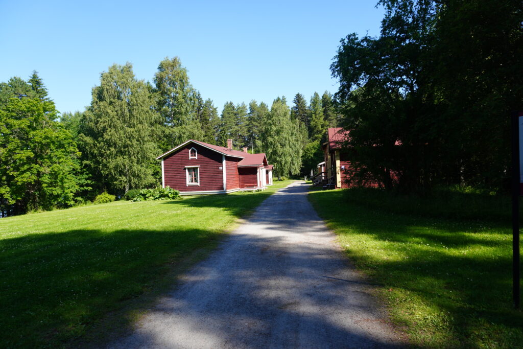 Juhani Ahon museon maiseman tienoilla kiersi kaunis ulkoilmareitti. Tallustelimme hellettä paossa puiden suojaamaa polkua pitkin joen varrella. Joen rannalla näkyi siellä täällä pieniä laitureita, ja ihmisiä vilvoittelemassa kuumana heinäkuisena aamupäivänä. Vastarannalla tönöttivät nätissä rivissä myös Koljonvirta campingin punaisen mökit.