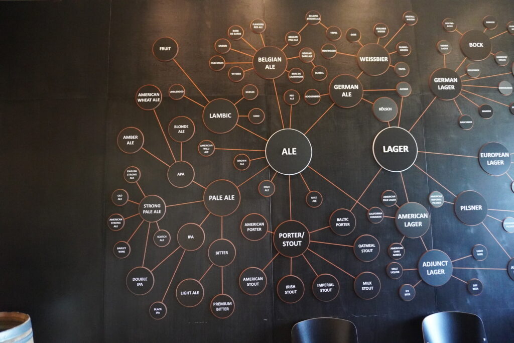 Panimomuseossa saattoi visuaalisesti hahmottaa oman olutmieltymyksensä sukuhaarat. Jakauduimme selkeästi kahteen leiriin suosikkiemme kanssa. Itse olen vahvasti Lager sukulinjan kannattaja. En ole ns. hedelmäisten juomien ystävä, joten yleensä passaan ALEt.