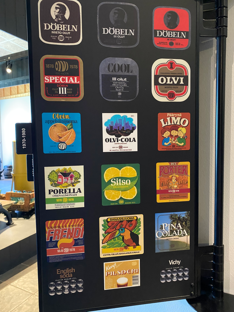 Museossa oli näytillä pulloja, ja etikettejä vuosien takaa. Uskon, että erityisesti nostalgiaa rakastavat pääsevät varmasti lämpimiin fiiliksiin eri vuosikymmenten design:iin tutustuessaan. Itselläni muutama etiketti herätti muistikuvia menneistä saari-juhannuksista. Tuolloin oli luksusta, kun lapsille oli tarjolla limsaa pulloista. Koria säilytettiin pihan maakellarissa.