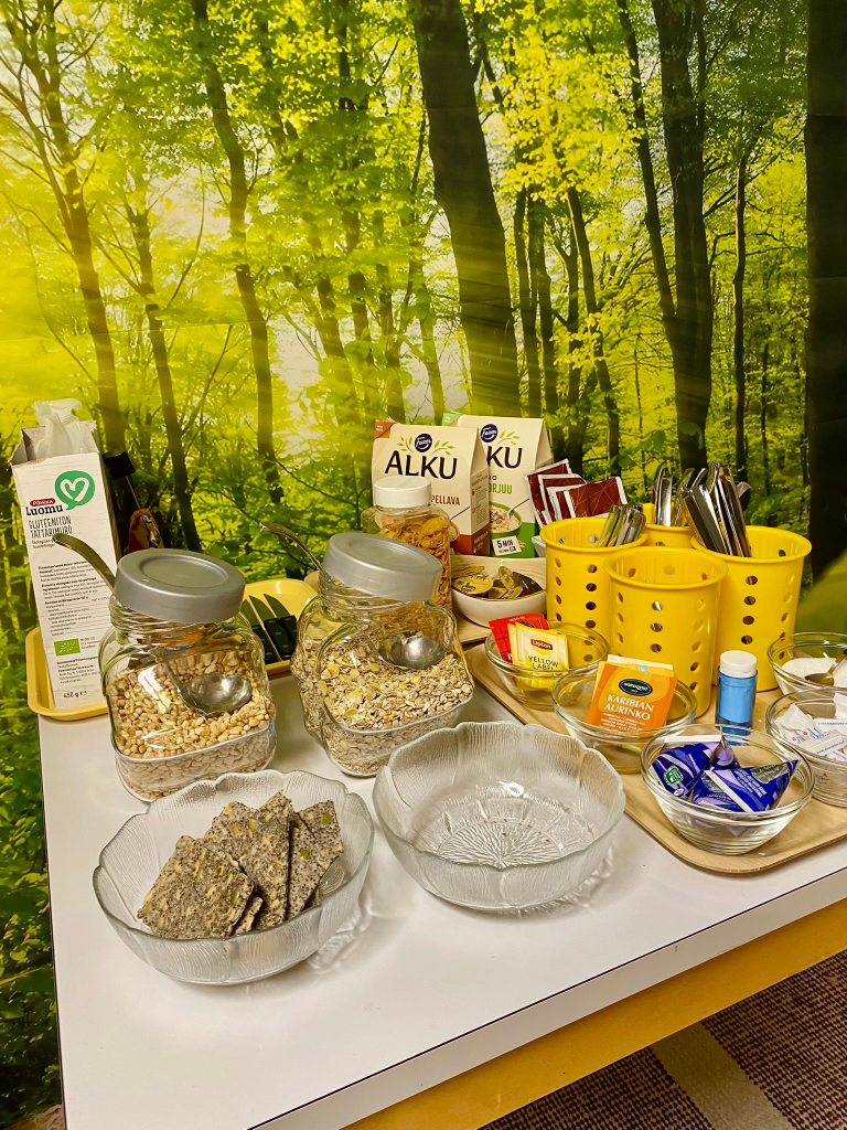 Näppäilimme sisäänkäyntiin ovikoodin ja astuimme ammoin vanhainkotina toimineeseen kartanoon. Hipsuttelimme hiljaa ensimmäisen kerroksen kodinomaisiin yleisiin tiloihin, josta löytyi myös aamupalat. Totesimme ilahtuneena, että sieltä löytyisi kaikille jotakin, joten ei tarvitsisi herätä aikaisemmin huoltoasema-aamupalan vuoksi.