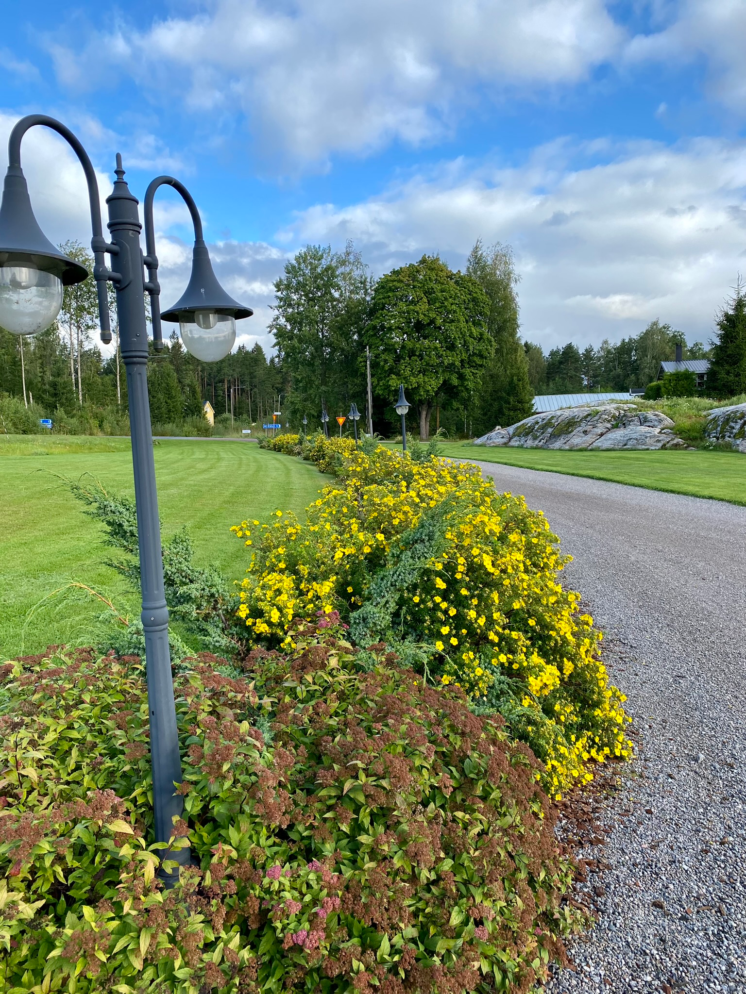 Takaisin asiaan. Aamupalan jälkeen ehdin vielä hetken ihastella Kaidanojan Kartanon erilaisuutta suhteessa ketjuhotelleihin. Kalusteet olivat vanhaa perua, ja siellä täällä ovistoppereina toimivat hauskat kissasäkit. Ulkoistutuksiin oli selkeästi panostettu, enkä ole nähnyt moista kukkaistutusten runsautta muualla. Voin vain kuvitella, että istutusten, ja vehreän tontin hoitamisessa saattaa vierähtää tovi, jos toinenkin. Selkeästi paikkaa hoiti viherpeukalo, sillä ympäristöstä huokui välittäminen.