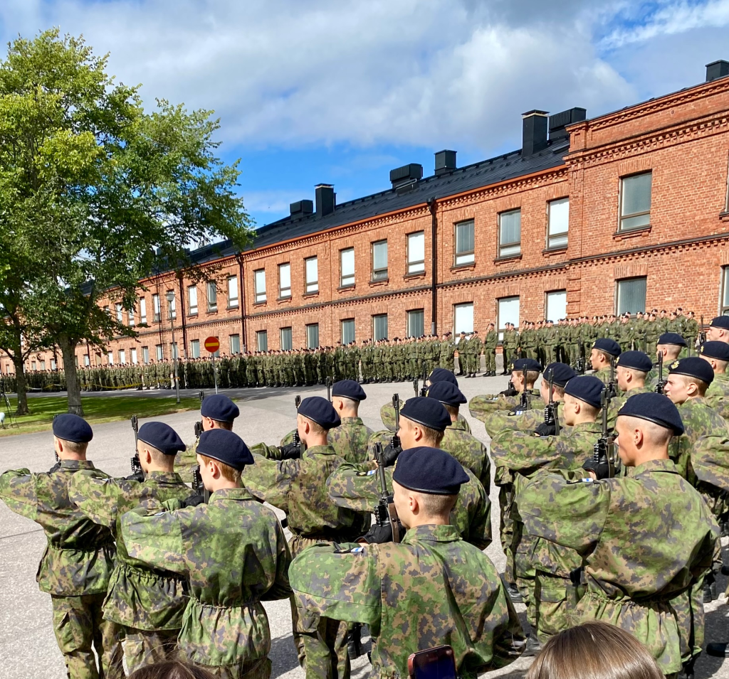 Kasarmilla valtava yleisömassa oli jakautunut isosti aukion ympäri. Olimme saanet pojalta epämääräiset ohjeet, että hän seisoo eturivissä toisen rakennuksen kohdalla. Alueellahan on useita rakennuksia, ja parikin sisäänkäyntiä, joten meillä ei ollut hajuakaan missä pitäisi seistä näkyvyyden maksimoimiseksi. Meitä kohtasi kuitenkin satumainen tuuri, koska pojan komppanja seisahtui juuri eteemme. Jos olisimme päivystäneet kentän toisella laidalla, ei pojasta olisi näkynyt vilaustakaan.