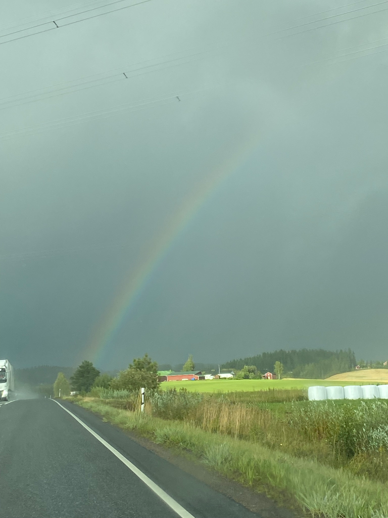 Olisimme kaipailleet sotkun munkkeja ennen kotiinlähtöä, mutta ulos asti polveileva jono ei houkutellut. Aurinkoinen sää vaihtui yhtäkkiä ennustettuun myrskyisään kaatosateeseen, joten turnauskestävyys ei vain kertakaikkiaan riittänyt. Odottelimme rankkasateen hiljenemistä tovin katoksen alla. Olin kiitollinen, että itse valatilaisuuden aikana aurinko oli vielä pilkottanut lämpimästi puolipilviseltä taivaalta, koska sadevarusteet könöttivät tietenkin autossa. Sateen laannuttua jätimme pojan haikein mielin vielä kahdeksi viikoksi palvelukseen ennen seuraavaa lomaa. Lukuisat sateenkaaret viitoittivat koti-matkaamme, kun lähdimme köröttelemään yhtä kokemusta rikkaimpina kohti lakeuksia.