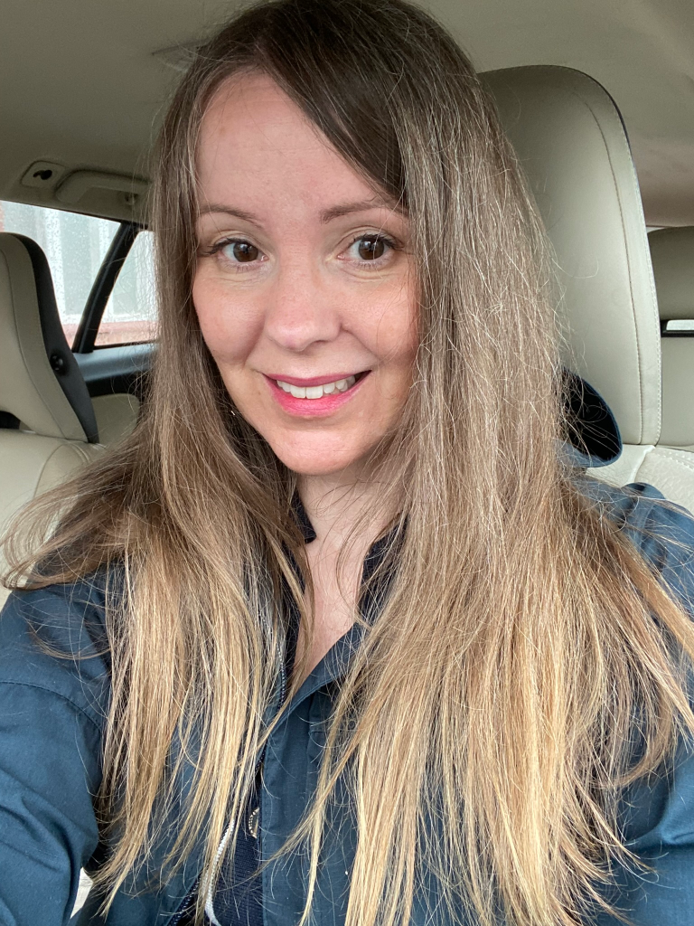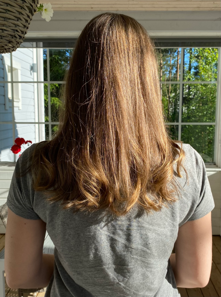 Kuva 4. 8.7.2025. (Iso hiusten tasaus samana päivänä, eli 8.7.. Kampaajani väänsi kiharaa latvaan, joten hiukset näyttävät ehkä lyhyemmiltä kuin tosielämässä.)