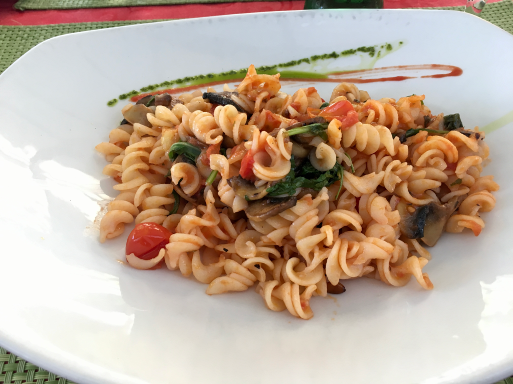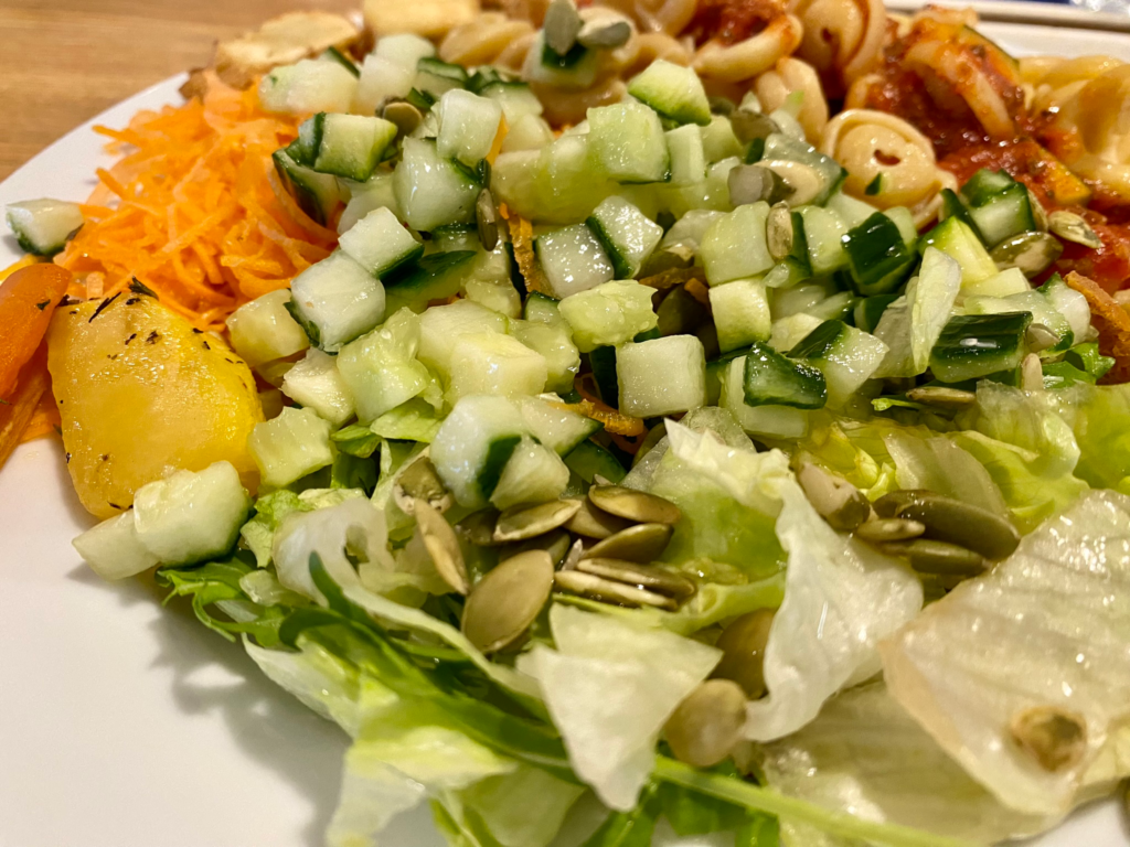 Lounailla herkuttelin megalomaanisilla annoksilla salaattia, kylkiäiseksi vain hieman pastaa, ja vielä vähemmän vegaanista pastabolognesekastiketta. Nämä olivat prosessoimattomia vaihtoehtoja, mutta kalorivajausta paikkaamaan lisäsin palan painikkeeksi tuoretta leipää. Tuoteselostetta näkemättä en voi tietää ko. leivän NOVA luokitusta.