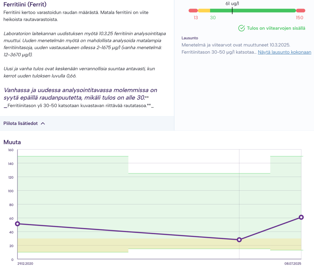 Olen ottanut tavaksi käydä Puhdin kokeissa vähintään kerran vuodessa. Yleensä kesäloman alkamisen kunniaksi. Heinäkuussa 2024 olin Liikkujan Puhti -paketin tulosten mukaan muutoin ns. vihreällä, paitsi varastoraudat olivat laskeneet alle vihreiden arvojen.