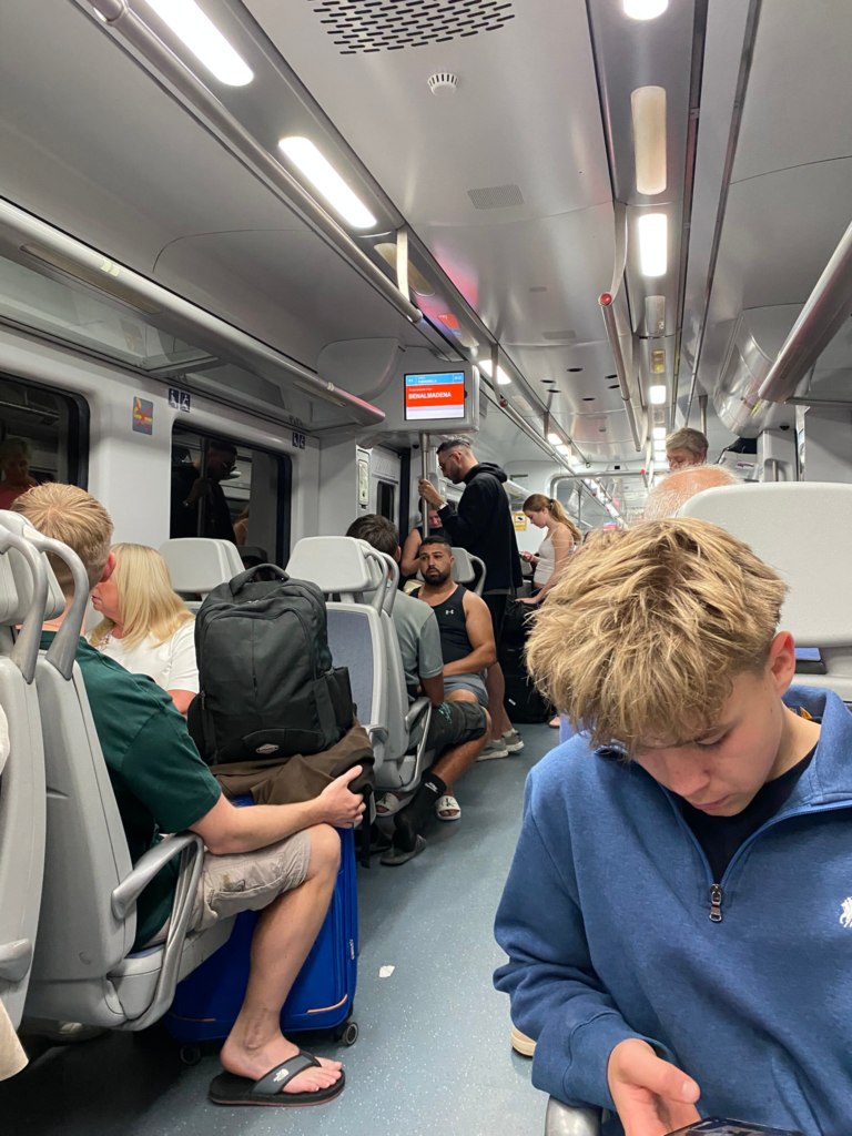 Juna oli ihan täynnä, joten isojen laukkujen kera oli hieman ikävä seisoskella tungoksessa. Istumapaikkoja ei löytynyt kuin vasta loppumatkasta. Espanjan illan lämpö yllätti suomalaisiin pitkiin vaatteisiin pukeutuneen matkaajan. Mutta, kyllähän se silti tuntui hienolta. Etelän kuuman kostea ilta, hikikarpalot selässä, ja kokonainen viikko muuttolintuna edessä.
