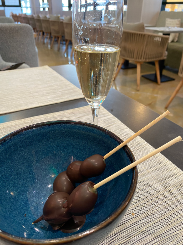 En ole eläissäni testannut minkäänlaisia fondueita, mutta nyt dippasin lähteessä viinirypäläitä. Tarjolla oli vielä kuohuvaa, joten tunsin todellakin olevani lomalla. Tosin, ihan ensimmäisenä aamuna emme todellakaan kehdanneet korkata kuohuvaa. Vasta konsultaatio kotisuomeen ja whatsapp-viesti, että “tietenkin otatte, tehän olette suomalaisia” avasi portit. Niin, miksipä ei?