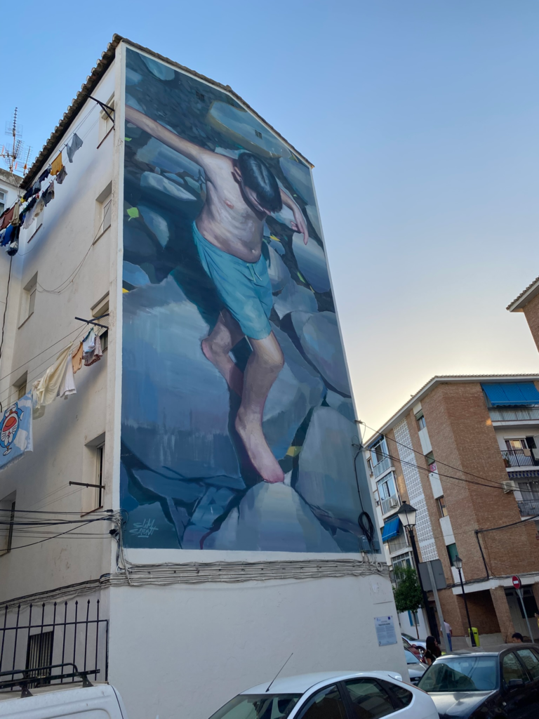 Viimeisen Fuge-päivän iltana ehdimme vielä katselemaan todella vaikuttavaa muraalitaidetta keskelle arkista kerrostalolähiötä. Kävelyetäisyydellä hotellistamme sijainneen lähiön useiden talojen päätyjä koristivat valtavan kokoiset taideteokset.