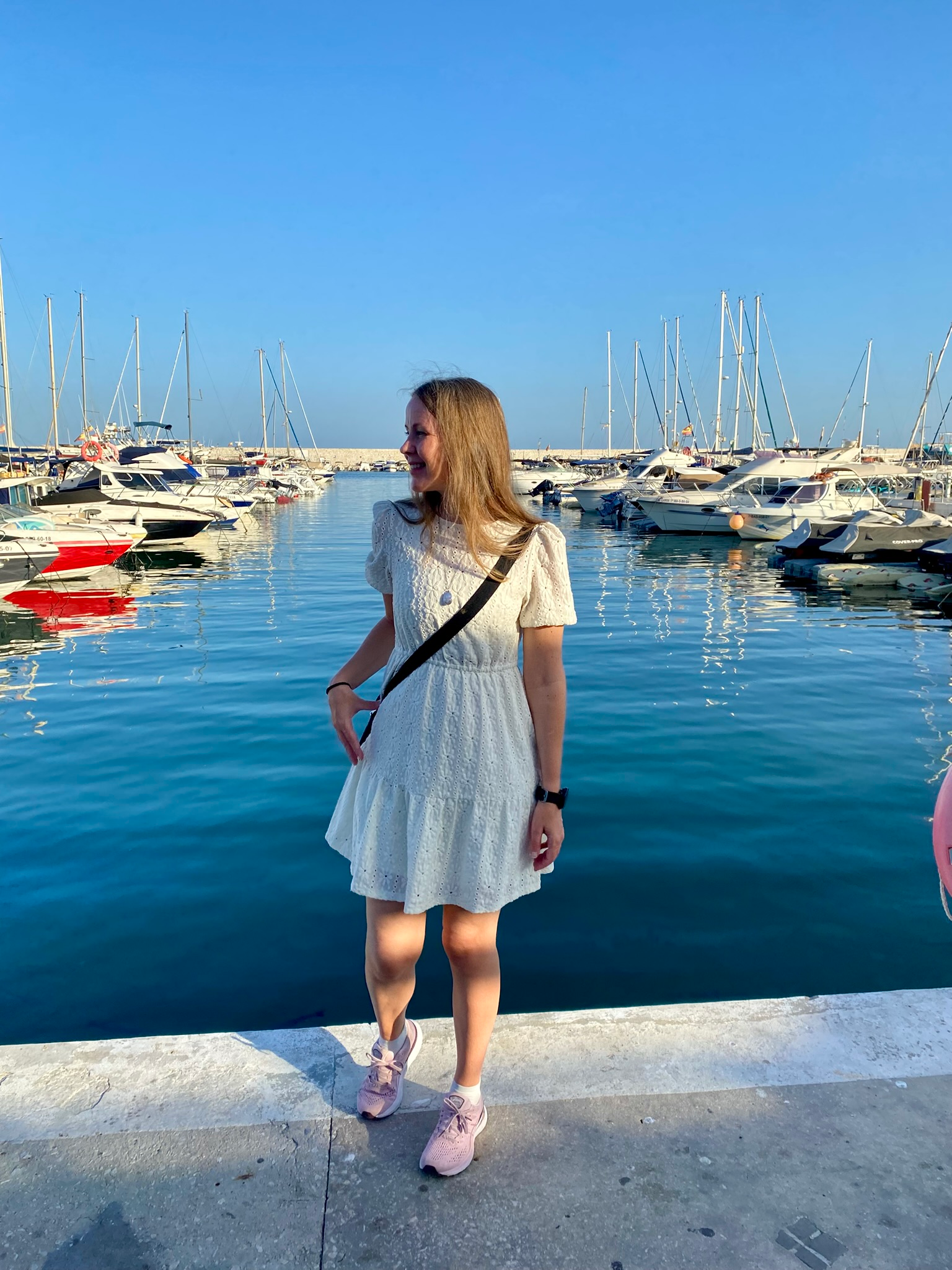 Kävelyn, varpaistelun ja kivibongauksen lisäksi tykkään töllätä erilaisia veneitä, olivatpa ne sitten pikkuruisia soutuveneitä, kalastaja-aluksia, jahteja tai komeita purjeveneitä. Edelleen yksi matkaunelmani olisi viettää loma purjehtien (tai sitten Atlantin yli rahtilaivalla). Fuengirolan satamassa on purjeveneitä rannat pulloillaan, mutta laitureille ei suinkaan päässyt maija meikäläinen samoilemaan. Harrastin merihaaveita siis hieman etäämmältä, vain parvekkeeltamme ja rantakadun varrelta.