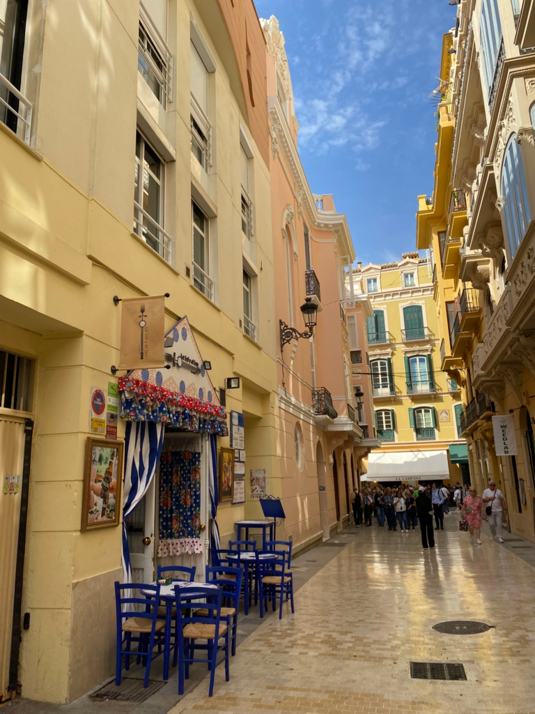 Kun isoissa kaupungeissa paistaa aurinko, niin taivas ei todellakaan ole sininen, vaan saasteiden harmaantama. Malagassa näkyi ihan ehta sinitaivas, joka loi mukavaa kontrastia vaaleankeltaisten, hiekanväristen ja muiden vaalean lämpimillä sävyillä maalattujen rakennusten kanssa. Matala arkkitehtuuri ei tuottanut klaustrofobista tunnelmaa. Jostain kauempaa tuulenvire toi kaduille hienovireisen suolaisen merentuoksun. Tämä kaikki loi itselleni mukavat positiiviset energiat.
